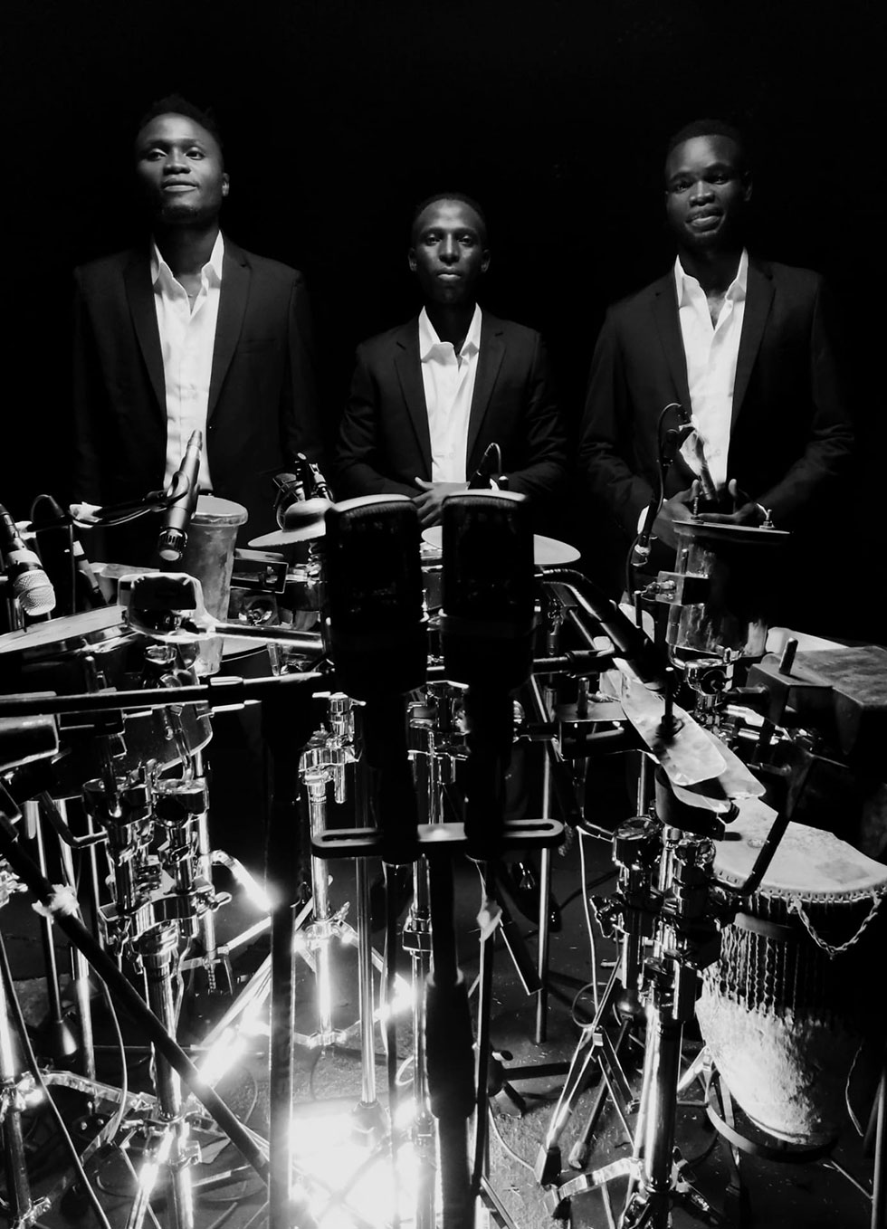 彼らのサウンドの核心にあるのは、ウガンダの彫刻家ヘンリー・セガムウェンゲが考案した、特注の鋼鉄製パーカッション・システムです。Roland TR-808の内部構造に着想を得たこの楽器は、激しい肉体性を伴って演奏されることで「生きたドラムマシン」と化し、ポリリズムのうねりと金属的な共鳴を放つキネティック・スカルプチャー(動く彫刻)となります。