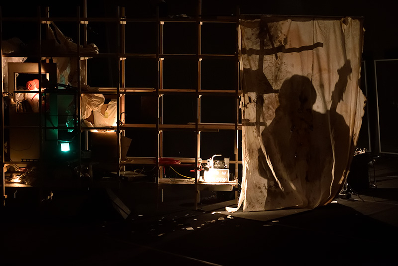 その後チェロをカホンのように叩くことによって、ドラムンベースのように、あるいはタブラによる打楽のようにビートの効いた演奏を披露し、さらにそのサウンドはエフェクター類を介して残響が強調されることによって、深海に沈み込むようなドローンへと変化していく。手元にある紐を中川が引っ張ると、頭上に置かれていた壊れたチェロ──これは中川が以前使用していた、初めて手にしたチェロだという──が落下し、そしてそこにくくりつけられたもうひとつの紐が「地球シーソー」を動かすことで照明とコンプレッサーが作動する。唸るようなコンプレッサーが切れるとチェロを置き、弓を空振りしながら「地球シーソー」の裏側へ。そしてもういちど紐を引っ張ることでシーソーをもとの傾きに戻してからあらためて椅子に座し、ヘッドホンを被って黙々とチェロを弾きはじめる。かさこそと静かな弦の音が会場内に響き、しばらくすると「曲ができました」と述べ、多重録音されたチェロが喚き叫ぶような楽曲がスピーカーから再生される。録音のプロセスを開示したとも、音からは切り離された演奏行為を披露してみせたとも言えるだろうか。シーソーを再度傾かせると聖骸布を模した大きな布がばさりと広がり、その裏に隠れるようにして中川は演奏しはじめる。複数の光源から照らされることによって、演奏する中川の影が様々にかたちを変えながら聖骸布に分身のように浮かび上がっていく。烈しさを増したサウンドは会場内で乱反射するかのように響きわたる。演奏を終えるとまたもやシーソーが動いて暗転し、小さなプレートにぼんやりと「No Playing」という蓄光シートによる文字が光りだす──同じプレートには先ほどまで「Now Playing」と表示されていたのだった。