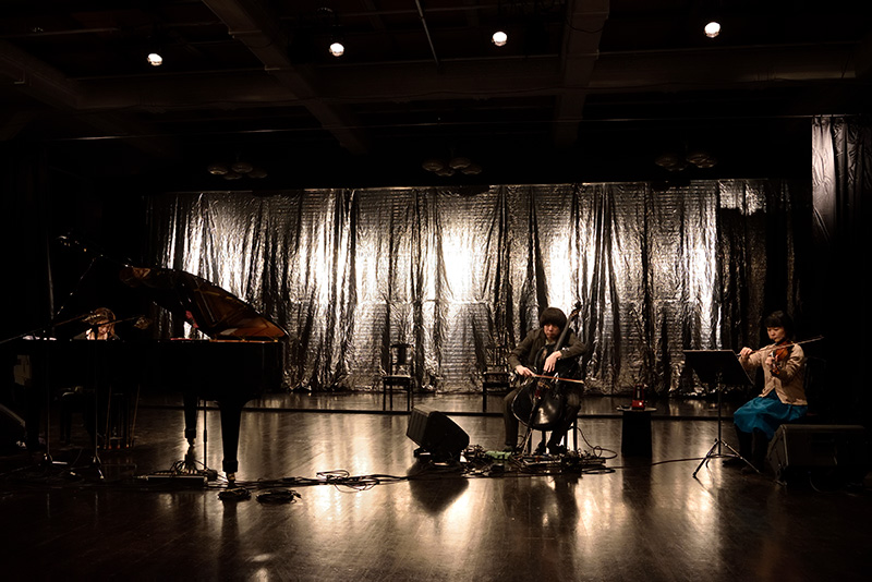 実は「黒子」の二人は「、バンド」のメンバーである出村弘美と穐月萌だったのである。もともとは俳優であり、ノン・ミュージシャンとして「、バンド」に参加していた彼女らは、転換をおこなうそぶりを見せながら、ステージ上でパフォーマンスをおこなっていたのだ。この二人が舞台後方の緞帳を開けると、煌びやかな銀色のカーテンが出現する。その煌びやかさに呼応するように「セクシーポーズー!」というかけ声の録音が再生される。水族館でおこなわれたアシカとセイウチのショーをフィールド録音した音源を流す「異なる遊戯と訓練の終わりの前にⅠ」という楽曲だ。チェロとヴァイオリンの二人がじりじりと弦を擦る不協和な音を出し、楽しげな海獣ショーの録音の再生が途絶えるとその鬱々としたノイズが前面に出てくる。そのうちに菊池が朗らかなピアノ・フレーズを弾きはじめた。だが唐突に演奏がなんども打ち切られ、海獣の雄叫びが再生されるとともにその鳴き声を模したかのような響きを三人が出す。音が引き起こす聴き手の感情の変化を聴き手自らに自覚させるかのように矢継ぎ早に変化するサウンド。続いて演奏されたのは「私たちとさえ言うことのできない私たちについてⅢ」という楽曲だった。こんどはヴァイオリンの横山が朗らかなメロディを奏でていく。そして彼女が一曲を演奏するあいだにピアノの菊池が三曲を、チェロの中川が五曲を演奏するというコンセプトの楽曲なのだが、この日はパフォーマーの出村と穐月が銀のカーテンを少しずつくるくると巻き上げていくなどの行為がさらに重なり、次第にステージ奥の窓がある空間が露わになっていった。