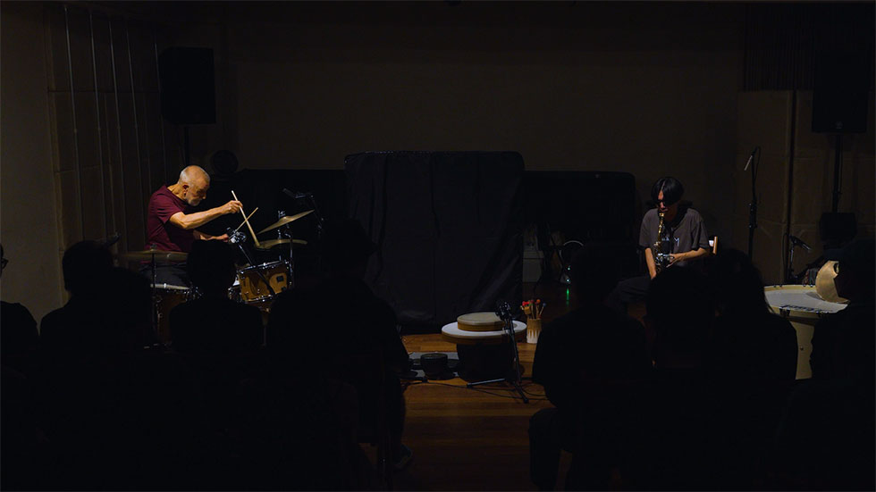 3Days公演の三日目は、ゲストにサックス奏者の松丸契、パーカッショニストの松本一哉を迎え、エディ・プレヴォがそれぞれとのデュオ・セッションを行った。プレヴォの希望もあってこの日は比較的若い世代のミュージシャンとの共演となったそうだが、結果として、まさにグッド・チョイスと言いたくなる組み合わせだった。1stセットは松丸とのデュオ。前日と同じくドラムセットと打楽器類、それぞれ二箇所の演奏場所が設けられ、松丸とのデュオではプレヴォはドラムセットを使用した。乱れ打つパルス・ビートに加え、時にシャッフル・ビートさえ取り入れたジャズ要素のあるプレヴォのドラミングに対し、松丸はサックスとは思えぬ音響の万華鏡的な広がり、高速フレーズ、さらには軋るような咆哮も放ちながら応じていく。触れたら切れてしまいそうなほどの緊張感だ。冒頭はリラックスしているように見えたプレヴォも、松丸の演奏に接して並々ならぬものを感じたからか、途中、二回ほどスティックを落下させてしまっていた。いや、現実には単に手が滑っただけなのだろうけれど、それほど興が乗ってきたと思えるほどの真剣さと愉しさに溢れたやり取りに聴こえた。同時にプレヴォはさすがは百戦錬磨のインプロヴァイザーでもあり、松丸の演奏を上手く引き立たせる術を心得ていたようにも感じた。中盤ではプレヴォがフレーズをリズミカルに反復させ、松丸のサックスの叫びと合わさって祝祭的な空気さえ醸し出していた。演奏時間は約30分。続いて休憩後、2ndセットで松本一哉とのデュオが始まった。松本はステージ中央に巨大な銅鑼を置き、その前に波紋音などの打楽器類を設置。プレヴォはドラムセットではなく打楽器類がセッティングされた場所に座った。パフォーマンスが始まると、松本は何かを探索するようにステージ周囲を歩き回る。無音状態が続き、プレヴォが先にシンバルの弓奏を始めた。だがその後、松本がタイミングを見計らって銅鑼に近づき、ゴム製のマレットで擦ると、まるで人の声のような、あるいは電子音のような、摩訶不思議なサウンドが鳴り響いた。巨大な銅鑼を見て力強い打撃音を想像していた向きには驚きが走ったことだろう。実際、銅鑼の響きを聴いた瞬間、プレヴォは「Wow!」といったふうに目を見開き、自らも銅鑼のような打楽器を用いた演奏へとシフトしていった。楽器から物質へと還元された素材が生み出す、音楽と名前がつく手前にあるような音響現象の交感。後半では松本は波紋音などを叩き音階を出していき、プレヴォもシンバルや金属類、弓などを組み合わせて応じていった。セッションは最後、両ミュージシャンが演奏を止めた後もしばし無音が続き、プレヴォがタオルを手に取ると、万雷の拍手によって約30分のパフォーマンスが締め括られた。