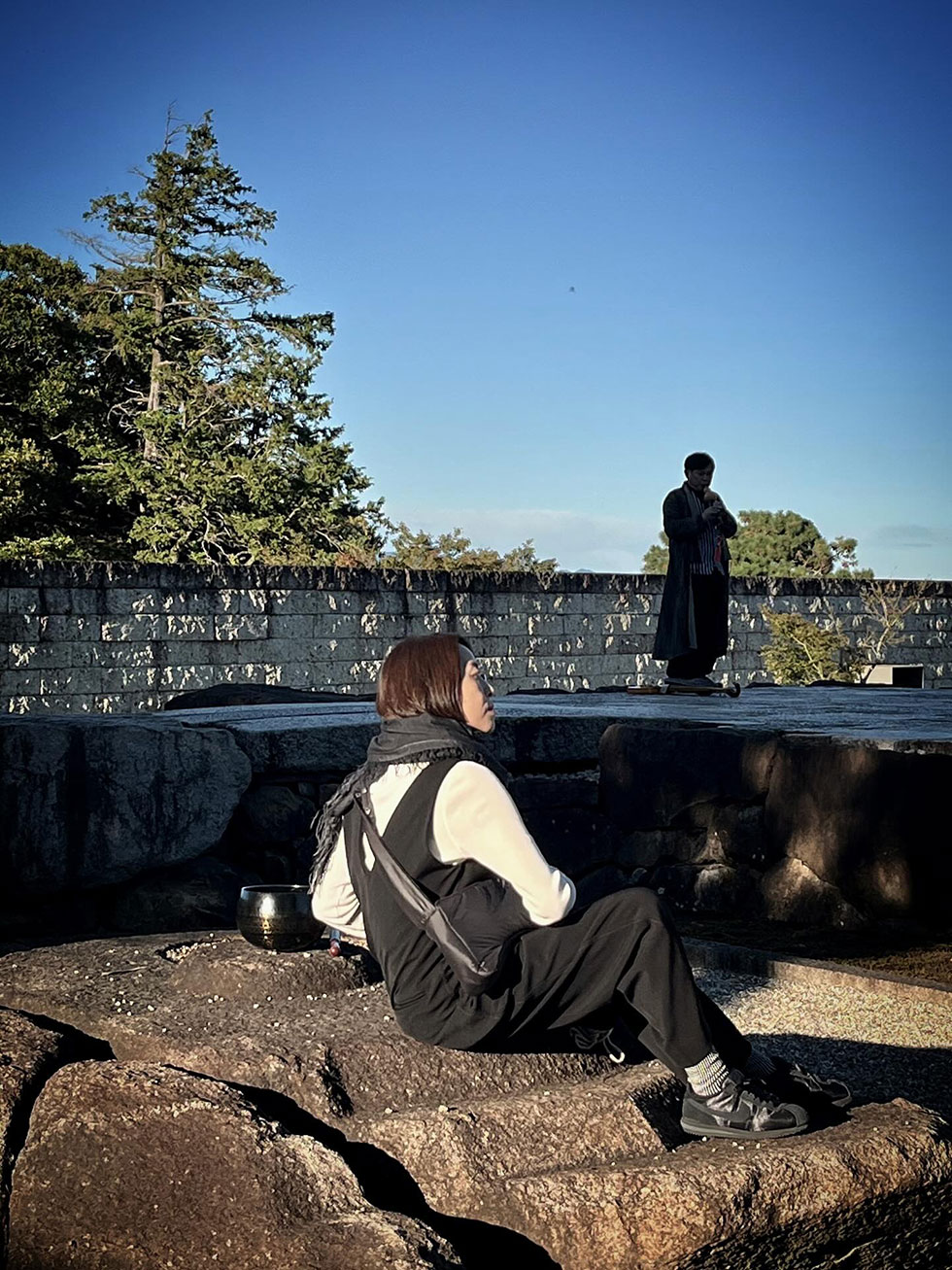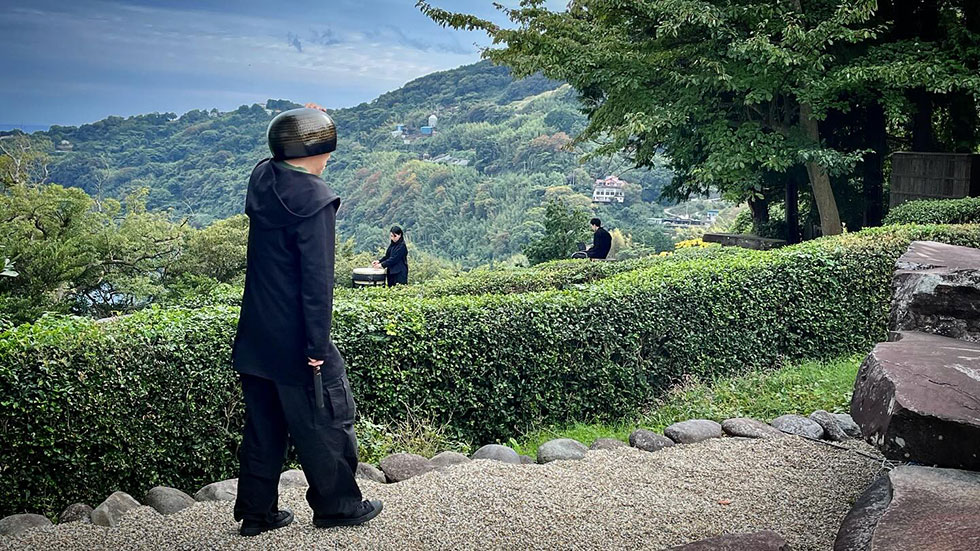 江之浦測候所での公演は、2022年から大友が同地で開催してきた「MUSICS あるいは複数の音楽たち」と題したイベントの第3弾を兼ねておこなわれた。江之浦測候所は現代美術作家・杉本博司が手掛けた、それ自体がアート作品でもあるような特異な施設である。100メートルの長大な廊下状のギャラリー、冒険心を擽るトンネルのような空間、石舞台、光学ガラス板を木琴のように敷いた舞台などがあるほか、海に面した斜面を下ると蜜柑畑や竹林が広がる。歩くだけでも景色の移ろいが楽しめ、鳥の囀りやカラスの鳴き声、航空機が過ぎる音、遠くを行く列車の走行音など、開けた空間ならではの豊かなサウンドスケープがある。パフォーマンスする演奏家にとっては、普段のライヴハウスとは勝手が異なり様々な制約がある一方、アプローチ次第ではこの場所ならではの表現ができる可能性を秘めた挑戦的な環境だと言えるだろう。