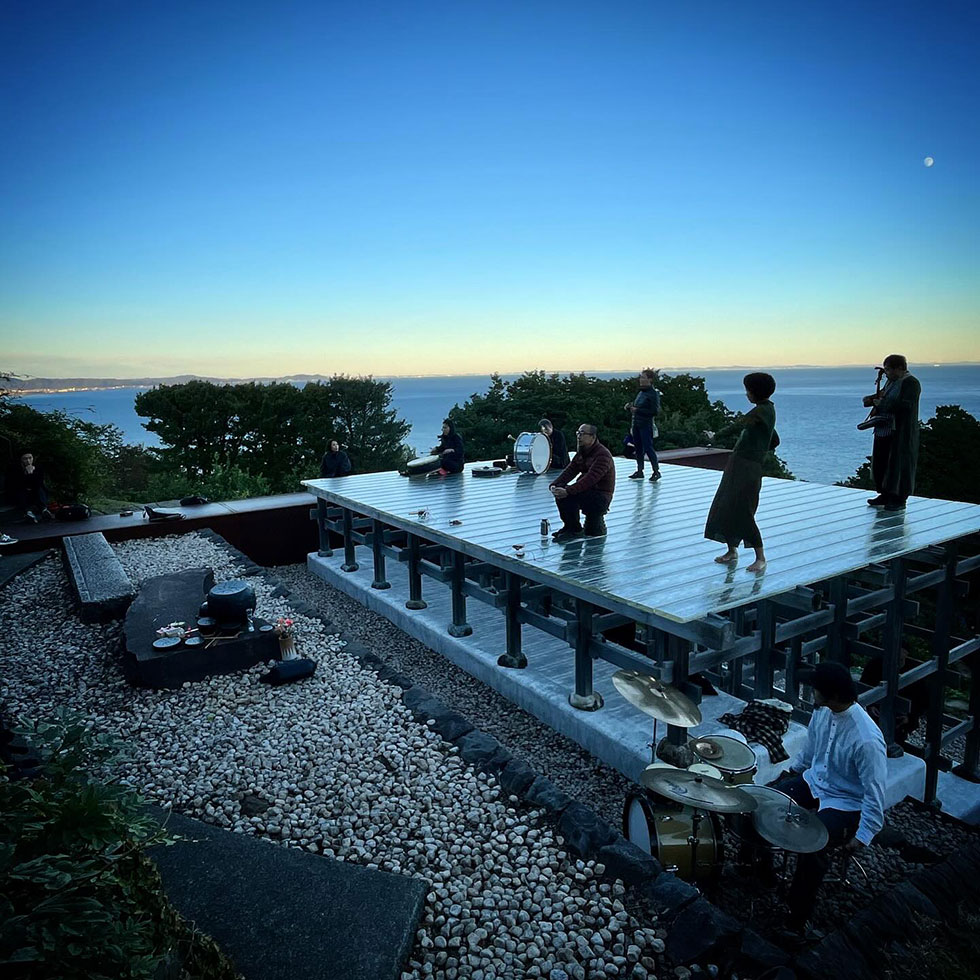 開演から2時間半ほど経ち、パフォーマーたちは光学硝子舞台に集まってきた。初めはダンサーの小暮香帆が舞台にひとりで立ち、相模湾を臨む絶景をバックに踊りを披露していた。次第にひとりまたひとりとパフォーマーが舞台に上がり、集団での緩やかな即興演奏を行なった。ほぼ全ての観客がこの舞台を眺めていたことだろう。広大な江之浦測候所の様々な場所で繰り広げられていたパフォーマンスを個々別々に体験してきた観客は、最後、この舞台上での集団即興の光景を共有する。バラバラだった景色が束の間の重なりを見せる。石舞台で始まり光学硝子舞台で終わる、まるでテーマで始まりテーマで終わるジャズのような構成。ただしその中間部はどこまでも自由で誰も把握し切れないほどの広がりを持つようなものとしての。