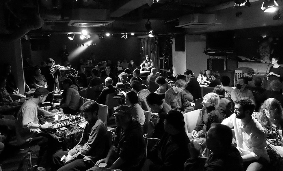 こうした全貌が把握し難い非記録的なアプローチは、新宿ピットインでのアジアン・ミーティング20周年記念の公演でも試みられた。11月6日、ピットインの会場は通常のようにステージと客席が一方通行的に分かれたセッティングではなく、会場内の至るところに楽器が置かれ、それらミュージシャンの持ち場を取り囲むようにステージの上にも下にも客席が設置されていた。座る場所によって目の前で演奏が見えるミュージシャンもいれば、音しか聴こえてこないミュージシャンもいる。1stセットではデュオ〜トリオの小編成による短いセッションを4つ行い、2ndセットでは全員が参加した集団即興をおこなった。むろん江之浦測候所に比べれば、ひとまずは全員の音を聴くことができるという意味で「全体」が把握できはする。