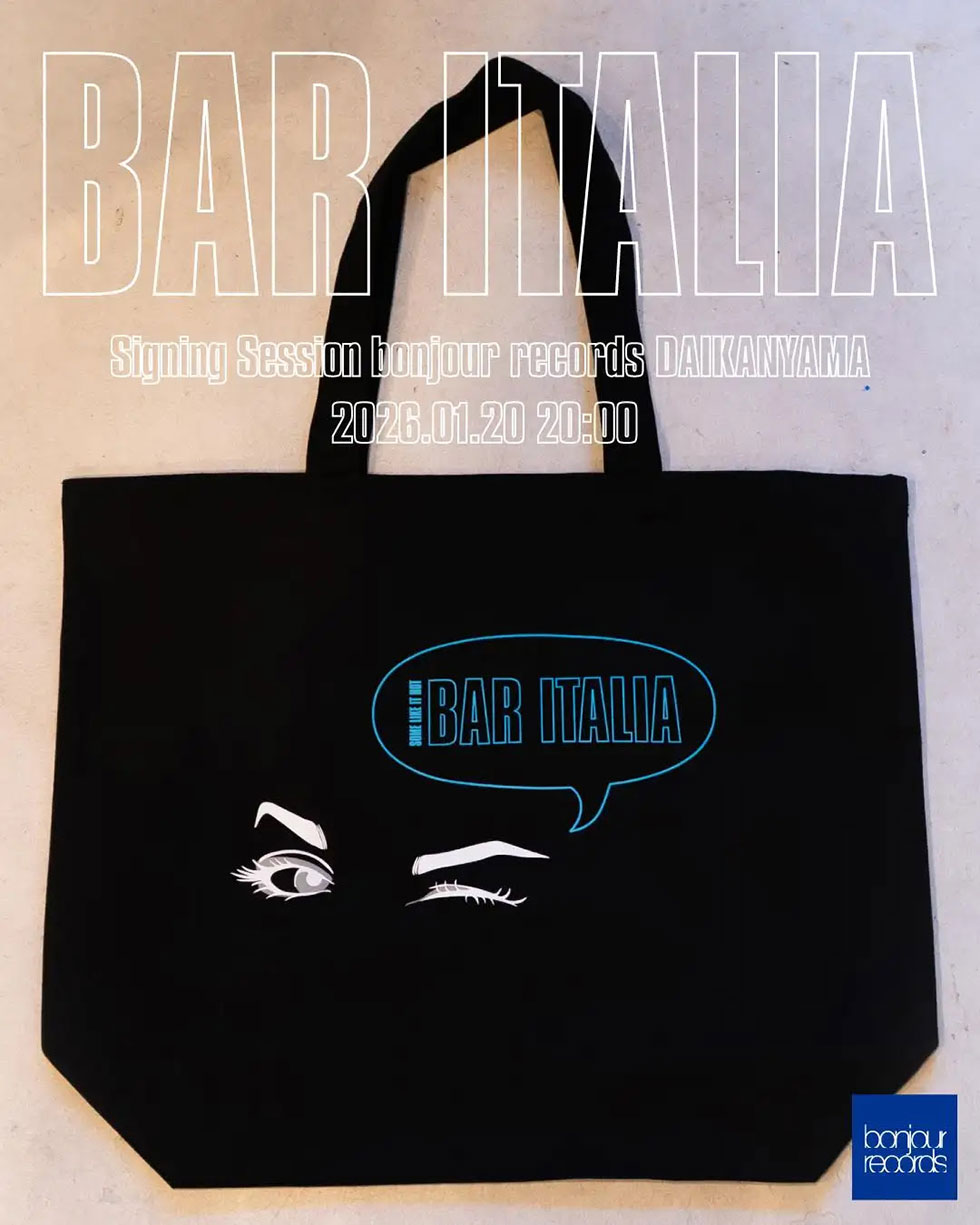 今回が初となる大阪での公演を含む来日ツアーが、いよいよ来月に迫ってきたバー・イタリア。その来日を記念して、限定デザインのトートバッグ(税込4,500円)が2025年12月20日(土)よりbonjour records DAIKANYAMAにて販売されることが決定した。また、その発売に合わせて、2026年1月20日(火)午後8時より、同店舗にてバンド全員が参加するサイン会が開催されることも決定した。