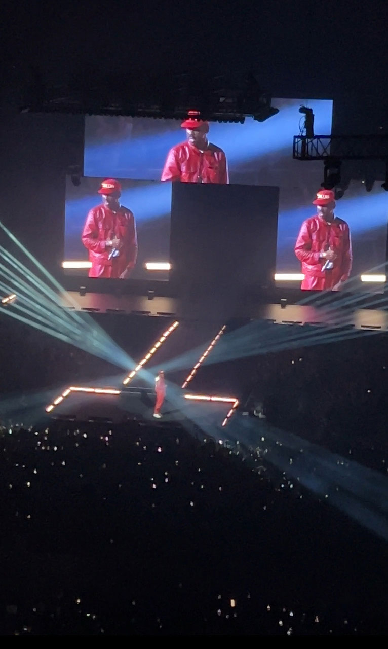 照明が落ち、巨大スクリーンが一斉に光を放つと、新作『Don’t Tap the Glass』の映像が流れはじめ、観客の熱気は一気に高まった。そしてそのまま、タイラーは“Big Poe”でアリーナ全体を揺らしにかかった。残念ながら私は三階席に追いやられてしまったが、周囲の観客の一部は、これがダンス・ミュージックであることを忘れてしまったかのように静かで、その分アリーナのフロアは熱狂的に応えていた。