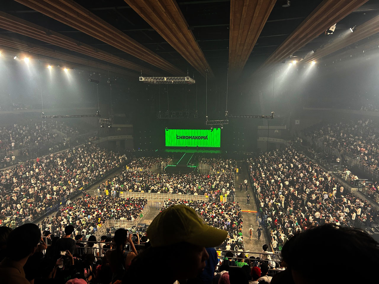 音楽自体は素晴らしく、タイラーは純粋なポジティヴ・エナジーの塊として、心を込めてラップを届けてくれた。もっと多くのラッパーがこうした愛情をもってパフォーマンスをすれば、と願わずにはいられなかった。しかし、それでもなお舞台演出には混乱の影が残った。これまでの公演映像を見返してきた私は、今年7月までのツアーでもタイラーが『Chromakopia』のプロモーションに集中し、仮面、アフリカ風のヘアスタイル、そして緑のスーツを纏っていたことを知っている。だが、新作『Don’t Tap the Glass』が突如リリースされたことで、そうした演出はすべて覆され、東京の観客はその世界観を体験できなかった。過去の公演映像で見た華麗な舞台美術を心から楽しみにしていたが、有明アリーナの舞台装置は巨大スクリーンがあるだけで、それ以上は何もなかった。この特別な東京公演における演出の物足りなさは、まさに痛手だった。仕事を休んでまで足を運んだ観客にとってはなおさらだ。
