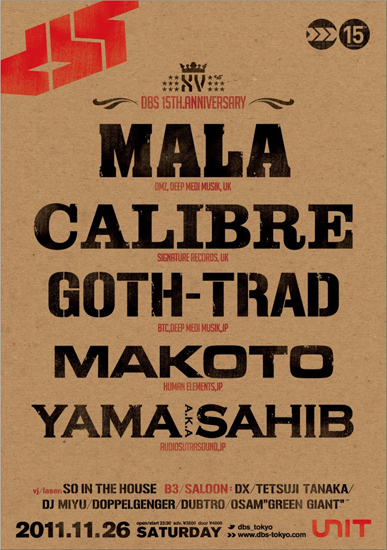 ★UKアンダーグラウンド・サウンズのリアル・ヴァイブスを伝えるべく1996年11月にスタートしたDBS (DRUM & BASS SESSIONS)が15周年を迎える。この15年間でドラム&ベース音楽は遺伝子となり、絶えることはない。そしてダブステップの潮流も同様、ベースミュージックと包括されつつも未来へ繋がって行くことだろう。DBSにとって節目となる今回の"DRUM & BASS x DUBSTEP WARZ"は、深遠なる独自の音宇宙を創るCALIBREとMALAの3度目の競演が実現!そして日本から世界に羽ばたくMAKOTO、GOTH-TRAD、YAMA a.k.a SAHIBらの参戦も決定!