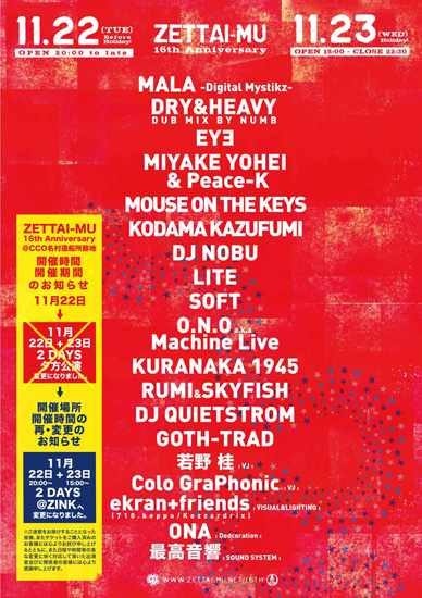 先日「開催期間/時間の変更」をお知らせ致しました、Zettai-Mu 16th Anniversary 2011 ですが、再度、会場であるCCOクリエイティブセンター大阪(名村造船所跡地)より、夕方公演でも会場の貸し出しを行わないと決断したとの連絡を昨日(11/12)受けました。