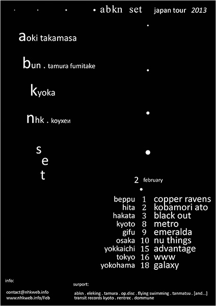 NHK:Aoki君のことは〈Raster Noton〉を通して知っていて、偶然ベルリンのテーゲル空港で見かけた所をナンパしました。Kyokaちゃんも〈Raster Noton〉繋がりで、ANBBのリキッドルームの楽屋で会いました。BunさんはAoki君経由でSNDのWWW公演で紹介してもらいました。筈。