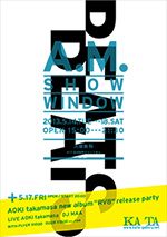 さらにまた、5月14日から5月18日まで、恵比寿リキッドルームの2階にあるKATAにて、AOKI takamasaとデザイナーのMAAとのデザイン・プロジェクト、〈A.M.〉の展示会が開かれる。開催中は、彼らの作品の展示のみならず、Tシャツの販売もあり。また、5月17日には、同所でアルバム『RV8』のリリース・パーティが開催される。