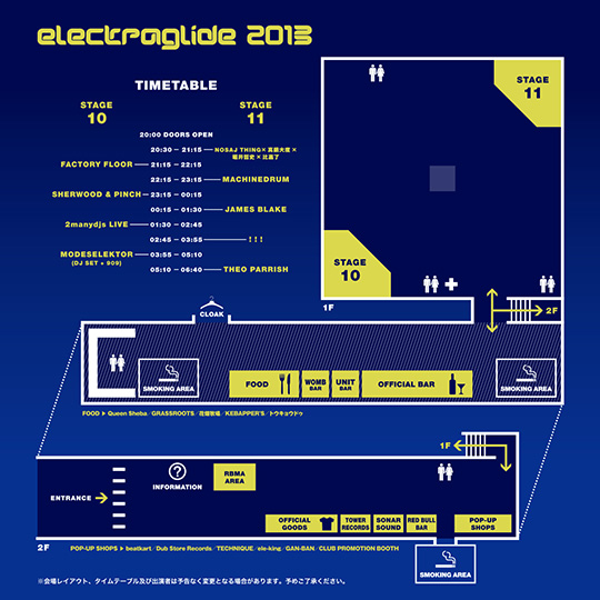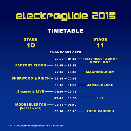 11月29日金曜日、幕張メッセ国際展示場にて開催される「エレクトラグライド2013」、当日のタイムテーブルが発表された。はい、ご覧の通りである。