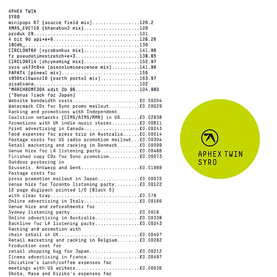 ご存じのように、公表されているアートワークには、曲名と制作費用の内訳、そして、リチャード・D・ジェイムスのバイオが掲載されているが、よく読めばわかるように、バイオはメチャメチャだ(笑)。アー写に関しては、いつものリチャード・D・ジェイムスといったところでしょう。