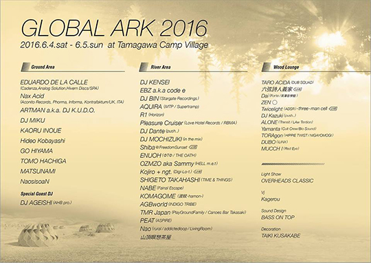 6月4日昼から6月5日までのあいだ、奥多摩をずうっと進んで山梨県に入るとある【玉川キャンプ村】にて「GLOBAL ARK」は開催される。入場は、前売りで5千円、当日で6千円。儲けるとか考えない。なによりもオリジナル・レイヴの精神によって生まれたこの野外レイヴ・パーティ、とくに「レイヴっていったいどんなものなの?」という若い人たち、梅雨入り前のいい季節だし、行ってみる価値は大いにありです!