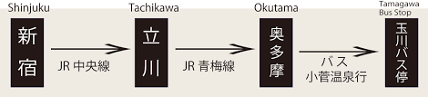 Shinjuku(JR Chuo Line) → Tachikawa(JR Ome Line) → Okutama → Transfer to the Bus to go Kosuge Onsen.Take this bus to Tamagawa Bus Stop