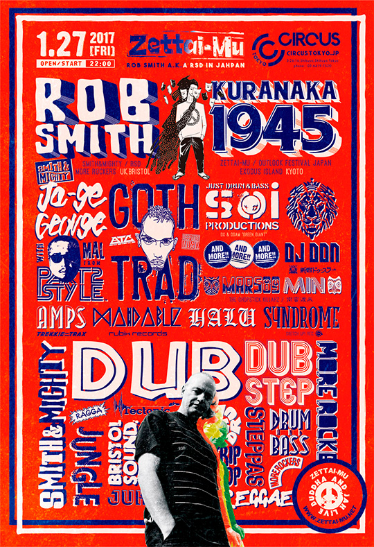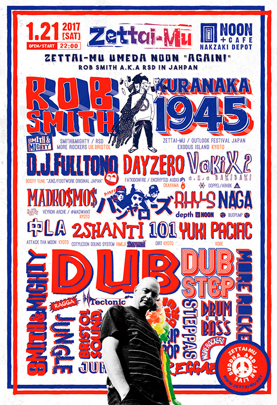 昨年からのKURANAKA ASIA TOUR、China、Shanghai、Beijing、Sichuan、Philippines、Manila、Thailand、Taiwan、Vietnam & Japan行脚を経て、 22年目になる2017年スタートの、1/21 (SAT) @ NOON (Umeda. Osaka)、1/27 (FRI) @ Circus Tokyo (Shibuya ShinMinamiGuchi. Tokyo) は、Massive AttackやWILD BUNCHとともに、 数々のオリジナリティあふれる革新的な音楽を生み出し続ける世界の音楽の発信地ブリストル・ミュージックの代表格SMITH&MIGHTYより、Jungle、Drum&Bass、Dubstep、Abstract Beats etc. のトップ・クリエイター&DJとして世界中に広がるシーンのリヴィング・レジェンド! ROB SMITH a.k.a RSDが登壇!!
