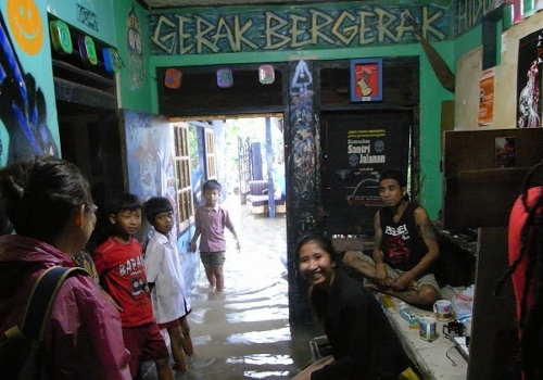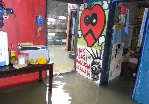 マージナルはそもそもスハルト政権時代に、政府に抗議する学生運動を通して生まれたこと、近所の人たちとはうまくやっていて政府から弾圧されるようなことがあってもみんなが守ってくれること、近所の子どもたちからすればタリンバビは第二の我が家みたいなものだということ。洪水の被害は心配していたほどではないようで、雨季にはよくあることなので洪水が来れば近所同士で声を掛け合い、手助けしあって荷物を二階に運んでいること等々。